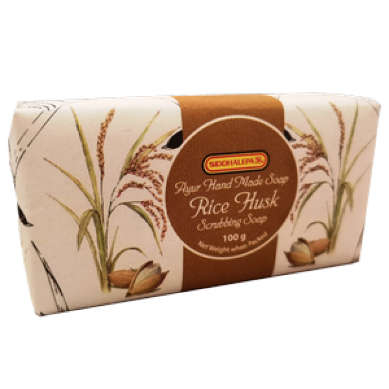 - This set of 2 handmade soaps features natural rice husk exfoliants, providing gentle yet effective cleansing for the skin.